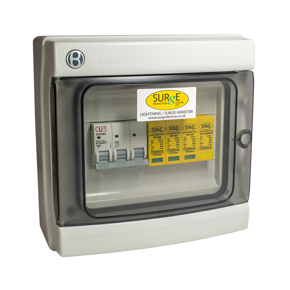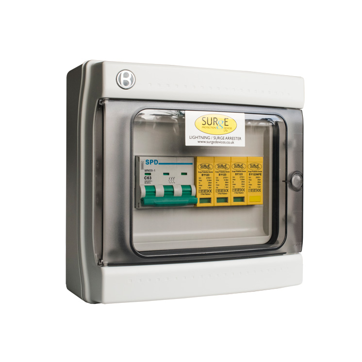 SY12350KA4P/ENCM – Type 1+2+3, 50kA, 3 phase, with window indication, complete in IP65 polycarbonate enclosure, including a 3 pole 63 amp MCB