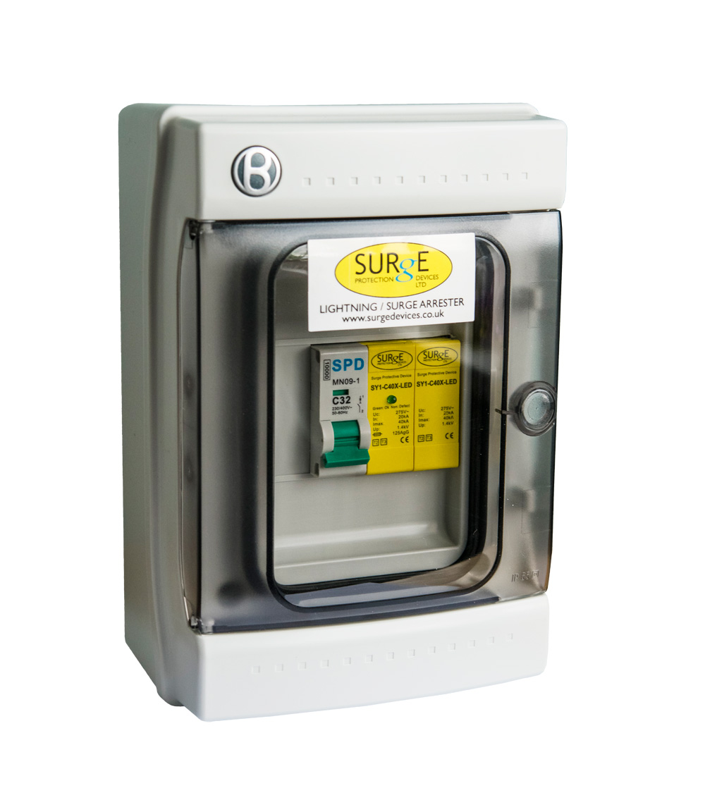 SY1C40XLED/ENCM – Type 2+3, single phase, with LED indication, complete in IP65 polycarbonate enclosure, includes a 32 amp MCB