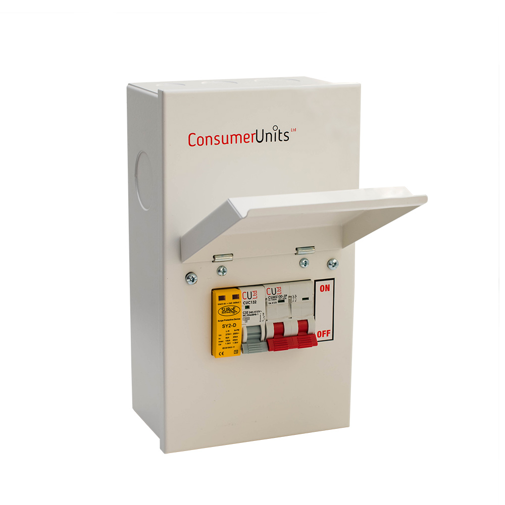 SY2DMS/ENCMET/M – Type 2+3 surge device, 100A main switch, complete in a metal enclosure with a 32A MCB
